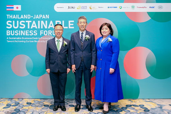 นายคุโรดะ จุน ประธานองค์การส่งเสริมการค้าต่างประเทศของญี่ปุ่น (JETRO) กรุงเทพฯ (คนกลาง) พร้อมด้วยนายนฤตม์ เทอดสถีรศักดิ์ เลขาธิการคณะกรรมการส่งเสริมการลงทุน สำนักงานคณะกรรมการส่งเสริมการลงทุน (BOI) (คนแรกซ้ายมือ)และ ดร.ชลจิต วรวังโส วีรกุล ผู้ช่วยเลขาธิการ สำนักงานคณะกรรมการนโยบายเขตพัฒนาพิเศษภาคตะวันออก (สกพอ.) (คนแรกขวามือ) ประกาศความร่วมมือในการก่อตั้ง Sustainable Business Desk ในงาน Thailand-Japan Sustainable Business Forum 2025 เพื่อเป็นศูนย์กลางการส่งเสริมความร่วมมือระหว่างภาครัฐและเอกชนไทย-ญี่ปุ่น ในการพัฒนาแนวทางธุรกิจที่ยั่งยืนและผลักดันสู่เป้าหมายความเป็นกลางทางคาร์บอน เมื่อเร็วๆ นี้