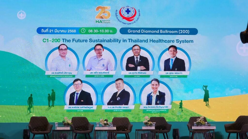 เมื่อวันที่ 21 มีนาคม 2568 ที่อาคารอิมแพ็ค ฟอรั่ม เมืองทองธานี จังหวัดนนทบุรี ภายในการประชุมวิชาการประจำปี HA National Forum ครั้งที่ 25 ของสถาบันรับรองคุณภาพสถานพยาบาล (องค์การมหาชน) หรือ สรพ. มีการเสวนาในหัวข้อ “อนาคตระบบบริการสุขภาพสุขภาพที่ยั่งยืน (The Future Sustainability in Thailand Healthcare System)” โดยมีผู้ที่เกี่ยวข้องมาให้ความรู้ และนำเสนอแนวทางการสร้างระบบบริการสุขภาพไทยในอนาคตให้ยั่งยืนและเป็นธรรม