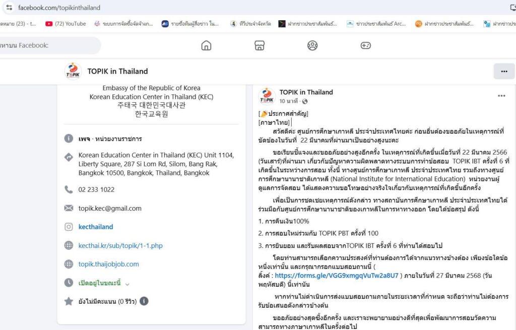โดยการกรอบใบสมัครและชำระเงิน เริ่มตั้งแต่ วันที่ 15 มกราคม 2568-23 มกราคม 2568 และตรวจสอบสถานะสอบตั้งแต่วันที่ 15 มกราคม 2568 เป็นต้นไป และวันตรวจสอบสิทธิ์ในการเข้าสอบในวันที่ 19 กุมภาพันธ์ 2568 และในวันสอบ คือวันเสาร์ที่ 22 มีนาคม 2568 ที่ผ่านมา (ตามสิทธิ์ที่เลือกสมัครสอบทั้ง 3 แห่ง) ทั้งนี้ทางศูนย์การศึกษาเกาหลี ประจำประเทศไทย ได้ ประกาศผ่านเว็บไซต์ https://topik.thaijobjob.com เพื่อรับสมัครสอบวัดความถนัดในภาษาเกาหลี(Topik PBT) ครั้งที่ 100 โดยกำหนดวันสอบในวันที่ 11 พฤษภาคม 2568 และได้ทำการเปิดรับสมัครไปเมื่อวันที่ 13 กุมภาพันธ์ 2568- 21 กุมภาพันธ์ 2568 ครั้งที่ 2 (ขณะนี้ปิดรับสมัครไปแล้ว) ซึ่งผู้สมัครสอบในวันเสาร์ที่ 22 มีนาคม 2568 ที่ผ่านมา (ตามสิทธิ์ที่เลือกสมัครสอบทั้ง 3 แห่ง) ได้เกิดปัญหาระบบการสอบทางคอมพิวเตอร์ล่ม ผู้สมัครสอบทุกคนไม่สามารถทำข้อสอบได้ ทำให้ผู้เข้าสอบทุกคนตกค้างไม่สามารถสอบ Topik1 และ Topik2 ได้ทั้ง 3 สนามสอบ ซึ่งล่าสุดคณะกรรมการศูนย์การศึกษาเกาหลี ใต้ ได้สรุปผลแนวทางในการตัดสินการสมัครสอบ Topik1 และ Topik2 โดยเป็นการสอบวัดระดับทางภาษาเกาหลี(TOPIK PBT) ประจำปี 2568 ครั้งที่ 1 ซึ่งผลสรุปของศูนย์การศึกษาเกาหลี ไม่เป็นที่น่าพอใจการผู้สมัครเข้าสอบ รวมถึงผู้ปกครองที่เกี่ยวข้อง โดยทางศูนย์การศึกษาเกาหลี ประจำประเทศไทย ได้แจ้งขออภัยในเหตุการณ์ที่ขัดข้องในวันที่ 22 มีนาคมที่ผ่านมาเป็นอย่างสูง และขอเรียนชี้แจงและขออภัยอย่างสูงอีกครั้ง ในเหตุการณ์ที่เกิดขึ้นเมื่อวันที่ 22 มีนาคม 2566 (วันเสาร์)ที่ผ่านมา เกี่ยวกับปัญหาความผิดพลาดทางระบบการทำข้อสอบ TOPIK IBT ครั้งที่ 6 ที่เกิดขึ้นในระหว่างการสอบ ทั้งนี้ทางศูนย์การศึกษาเกาหลี ประจำประเทศไทย รวมถึงทางศูนย์การศึกษานานาชาติเกาหลี (National Institute for International Education) หน่วยงานผู้ดูแลการจัดสอบ ได้แสดงความขอโทษอย่างจริงใจผ่าน https://www.facebook.com/topikinthailand เกี่ยวกับเหตุการณ์ที่เกิดขึ้นอีกครั้ง และเพื่อเป็นการชดเชยเหตุการณ์ดังกล่าว ทางสถาบันการศึกษาเกาหลี ประจำประเทศไทยได้ร่วมมือกับศูนย์การศึกษานานาชาติของเกาหลีในการหาทางออก โดยได้ข้อสรุป ดังนี้