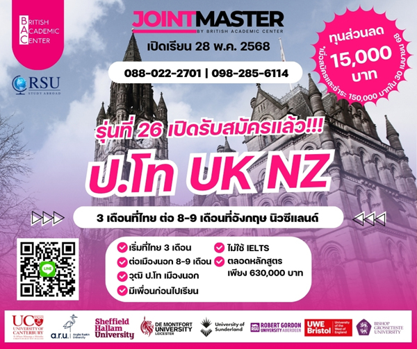 RSU Study Abroad มหาวิทยาลัยรังสิต เปิดรับสมัครนักศึกษาระดับปริญญาโทที่ต้องการศึกษาต่อต่างประเทศ ในโครงการ Joint Master รุ่นที่ 26 ประเทศอังกฤษ ประเทศนิวซีแลนด์ โดยสามารถสมัครได้ตั้งแต่วันนี้ – 30 เมษายน 2568 พร้อมรับสิทธิพิเศษ ส่วนลดมูลค่า 15,000 บาท ทั้งนี้ ผู้ที่สนใจสามารถสอบถามรายละเอียดเพิ่มเติมได้ที่ รายละเอียดเพิ่มเติมที่ได้ที่ LINE: @rsustudyabroad หรือ โทร.088-022-2701, 098-285-6114