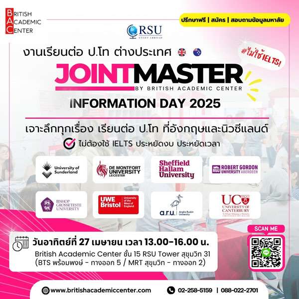 RSU Study Abroad มหาวิทยาลัยรังสิต จัดกิจกรรมแนะแนวศึกษาต่อปริญญาโทต่างประเทศ Joint Master รุ่นที่ 26 ในวันอาทิตย์ที่ 27 เมษายน 2568 เวลา 13:00-16:00 น. ณ British Academic Center ชั้น 15 อาคาร RSU Tower สุขุมวิท 31 (ตรงข้ามเอ็มสเฟียร์, BTS สถานีพร้อมพงษ์) กรุงเทพฯ สำหรับผู้ที่สนใจสามารถสอบถามรายละเอียดเพิ่มเติมได้ที่ โทร. 088-022-2701, 098-285-6114 หรือ LINE: @rsustudyabroad