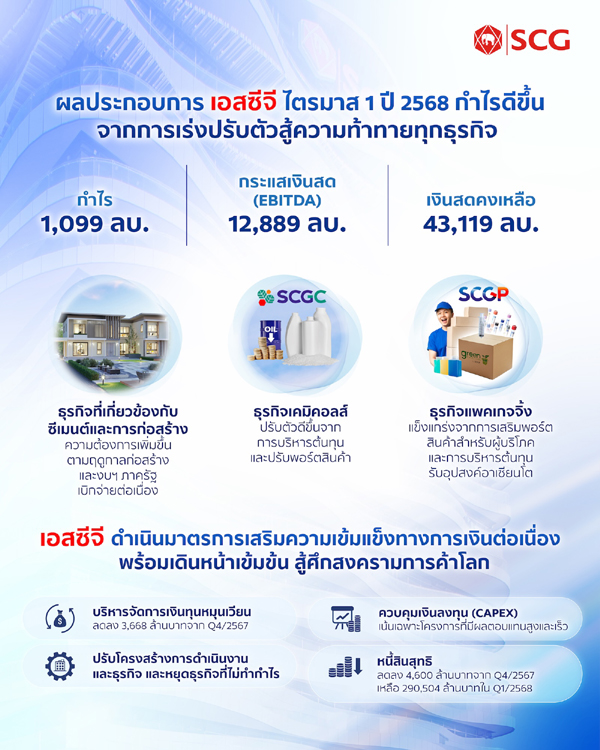 เอสซีจี เผยผลประกอบการไตรมาส 1 ปี 2568 ดีขึ้นกว่าไตรมาส 4 ปี 2567 กระแสเงินสด (EBITDA) แข็งแกร่งต่อเนื่อง 12,889 ล้านบาท กำไร 1,099 ล้านบาท จากการเร่งปรับตัวสู้ความท้าทายในทุกธุรกิจ และมาตรการเสริมความเข้มแข็งการเงินต่อเนื่อง พร้อมยกระดับ “4 กลยุทธ์”
