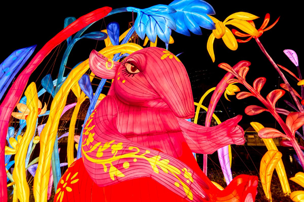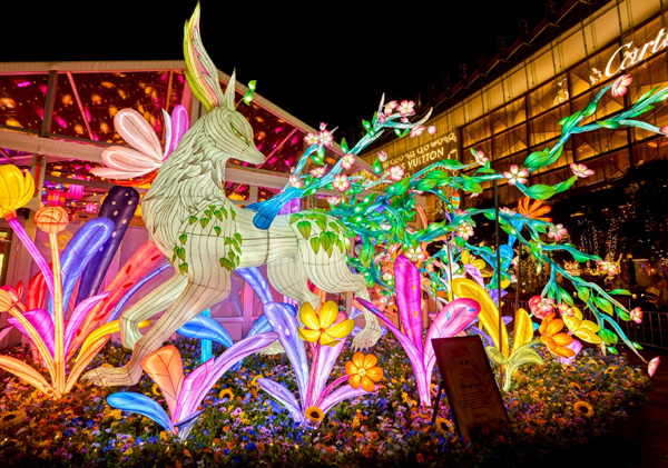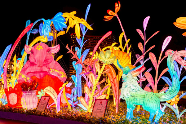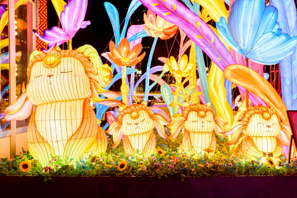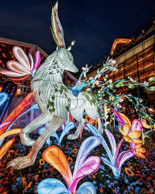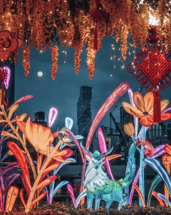 มีกลุ่มโคมไฟที่ชื่อว่า “สัตว์เทพมอบพร” ตรงกลางคือ “จุนจุน” สัตว์เทพน่ารักจากยุคราชวงศ์โจวตะวันตกของจีน เชื่อกันว่าสามารถกลืนกินฝันร้ายได้ เป็นนางฟ้าผู้พิทักษ์แห่งความฝัน ด้านซ้ายของจุนจุนคือ “เว้ยโซ่ว” ภูตวิเศษที่สามารถขับไล่สิ่งชั่วร้ายและสิ่งอัปมงคล ด้านขวาคือ “หลิงเมา” แมวเทพผู้มีพลังสืบพันธุ์ตนเอง เป็นสัญลักษณ์ของความสงบสุขและการอยู่ร่วมกัน กลุ่มโคมไฟ “สัตว์เทพมอบพร” นี้เปี่ยมด้วยคาอวยพรให้แก่ทุกท่าน พร้อมสื่อถึงการผสมผสานระหว่างวัฒนธรรมจีนและมิตรภาพที่ยั่งยืนอีกด้วย