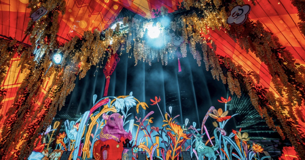 เป็นที่ตั้งของเวทีหลักของงานซึ่งมี “กระจกเวทมนตร์แห่งกาลเวลา” ตั้งตระหง่านอยู่กลางเวทีให้ผู้ชมสามารถมองผ่านกระจกและเหมือนได้ทะลุเข้าสู่โลกเทพนิยายโบราณของจีนที่มีพืชพรรณวิเศษและดอกไม้นานาพันธุ์บานสะพรั่ง โดยการออกแบบโคมไฟดอกไม้ต่างๆได้ใช้สี 7 สีเพื่อแทนแต่ละวันในสัปดาห์ตามความเชื่อของไทย ความเชื่อท้องถิ่นนี้จึงถูก อีกด้านของกระจกเวทมนตร์มี “กิเลน” สัตว์เทพในตำนานของจีนกำลังเล่นอย่างร่าเริงซึ่งเป็นสัญลักษณ์แห่งสิริมงคลที่จะมอบคำอวยพรแก่ชาวไทย