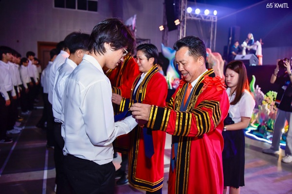 รองศาสตราจารย์ ดร.คมสัน มาลีสี อธิการบดี สจล. กล่าวให้โอวาทแก่นักศึกษาใหม่ในงานปฐมนิเทศนักศึกษาชั้นปีที่ 1 ประจำปีการศึกษา 2568 ว่า “รู้สึกภาคภูมิใจที่นักศึกษาได้เข้ามาเป็นส่วนหนึ่งของ ‘ลูกพระจอม’ พร้อมเน้นย้ำถึงความพร้อมของสถาบันทั้งด้านวิชาการและกิจกรรมนักศึกษา ที่จะช่วยส่งเสริมการเรียนรู้และการใช้ชีวิตอย่างสมดุล ที่ สจล. เรามีกิจกรรมที่หลากหลาย รองรับไลฟ์สไตล์ของนักศึกษา ทั้งฟิตเนส, การฝึกไดรฟ์กอล์ฟ, สนามกีฬา กิจกรรมจากชมรมต่างๆ ที่พร้อมผลักดันน้องๆ ในทุกความฝัน เช่นชมรม Cover Dance ที่ได้รับรางวัลชนะเลิศระดับประเทศ ส่วนการดูแลความปลอดภัยและชีวิตของนักศึกษาดำเนินการด้วยระบบ SMART AND SAFE UNIVERSITY ทั้งระบบการตรวจจับใบหน้า, การติดตั้งกล้อง CCTV รอบสถาบัน, การจัดระบบรถโดยสารวนรอบมหาวิทยาลัยไปจนถึง AIRPORT LINK ผ่านการติดตามเส้นทางด้วย KMITL UAPP รวมถึงการเรียนรู้ผ่านการลงมือปฏิบัติจริงในห้องแล็บที่ทันสมัย พร้อมเทคโนโลยีล้ำสมัยมากมาย นอกจากนี้ เรายังมีโครงการพิเศษที่เปิดประสบการณ์ให้นักศึกษาได้สัมผัสชีวิตใน 2 โลเกชัน คือ ‘วิถีดาวและดิน’ ที่ด่านช้าง จ.สุพรรณบุรี เพื่อเรียนรู้จากธรรมชาติ และ ‘ไลฟ์สไตล์ทะเล’ ที่ชุมพร เพื่อเติมพลังชีวิตที่สร้างสรรค์”