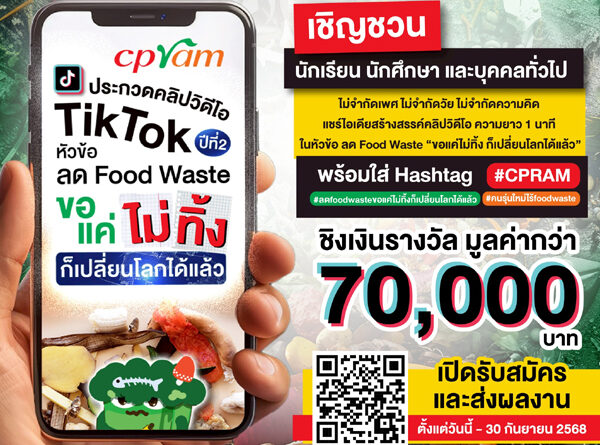 บริษัท ซีพีแรม จำกัด (CPRAM) ผู้นำด้านอุตสาหกรรมอาหารพร้อมรับประทาน สานต่อเจตนารมณ์การพัฒนาสังคมอย่างยั่งยืน เดินหน้าภารกิจเพื่อสิ่งแวดล้อมอย่างต่อเนื่อง จัดกิจกรรมประกวดคลิปวิดีโอ TikTok ความยาว 1 นาที ภายใต้หัวข้อ “ขอแค่ไม่ทิ้ง ก็เปลี่ยนโลกได้แล้ว” เปิดพื้นที่ให้ประชาชนทั่วไปได้ร่วมเป็นส่วนหนึ่งในการสร้างความเปลี่ยนแปลงผ่านแนวคิดลดขยะอาหาร (Food Waste) อย่างง่าย ๆ ได้ด้วยตัวคุณเอง พร้อมชิงเงินรางวัลรวมกว่า 70,000 บาท พร้อมใบประกาศเกียรติคุณ เปิดรับสมัครและส่งผลงานได้ตั้งแต่วันนี้ – 30 กันยายน 2568