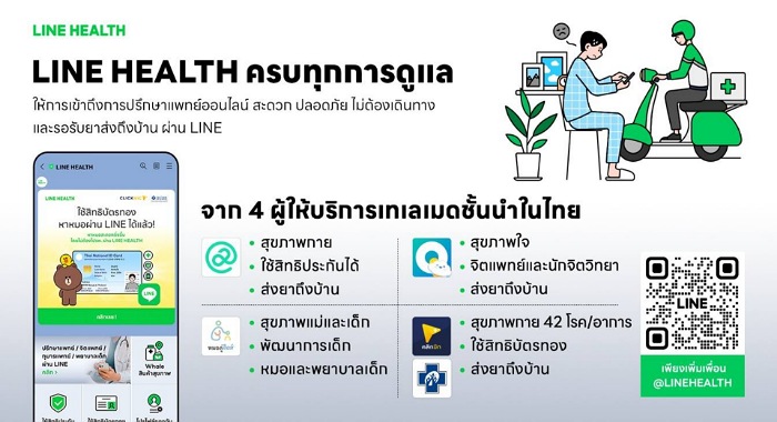 หาหมอบน LINE ได้แล้ววันนี้! LINE ประเทศไทย เปิดตัว “LINE HEALTH” ทางเลือกใหม่ของการดูแลสุขภาพสำหรับคนไทยอย่างเป็นทางการ เชื่อมต่อผู้ใช้ LINE ทั่วไทยเข้ากับ 4 ผู้ให้บริการหมอออนไลน์ Clicknic – Health at Work – หมอคู่คิดส์ – ooca ผ่านบัญชีทางการเดียว (@linehealth) เพียงเพิ่มเพื่อน เข้าปรึกษาแพทย์หรือผู้เชี่ยวชาญ รอรับยาที่ส่งถึงบ้าน ดูแลครอบคลุมทั้งสุขภาพกาย ใจ และหมอเด็ก เข้าถึงง่าย สะดวก ปลอดภัย ไม่ต้องเดินทาง พร้อมรองรับสิทธิบัตรทอง 42 กลุ่มอาการโรคทั่วไปและประกันกลุ่ม สะท้อนเจตนารมณ์ของ LINE ในการยกระดับคุณภาพชีวิตคนไทย เป็นส่วนหนึ่งในการช่วยขับเคลื่อนบริการสาธารณสุขของประเทศ