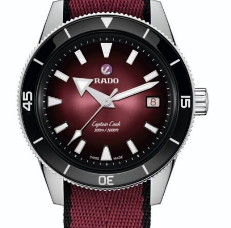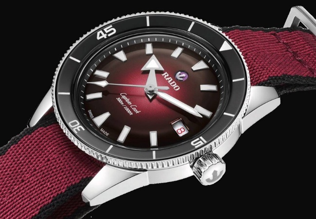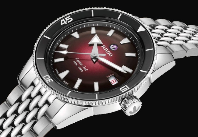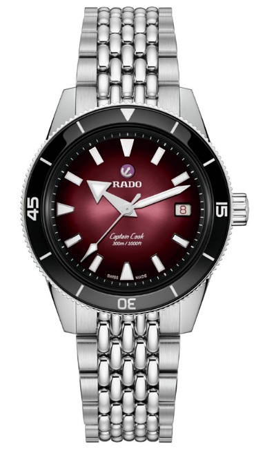 แรงบันดาลใจจากนาฬิการุ่นวินเทจปี 2505 ถูกตีความใหม่อย่างร่วมสมัยใน Rado Captain Cook ที่มาพร้อมตัวเรือน สแตนเลสสตีลขัดเงาขนาด 39 มม. โดดเด่นด้วยหน้าปัดไล่เฉดสีดำสู่เบอร์กันดีที่ให้บรรยากาศคลาสสิกแต่ทันสมัย
