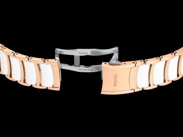 สายสแตนเลสสตีลเคลือบ PVD โรสโกลด์ ขัดเงาสลับข้อต่อเซรามิกสีขาวไฮเทค เสริมความทันสมัยและสง่างาม ปิดท้ายด้วยบานพับล็อกสามทบเพื่อความมั่นใจสูงสุดในการสวมใส่