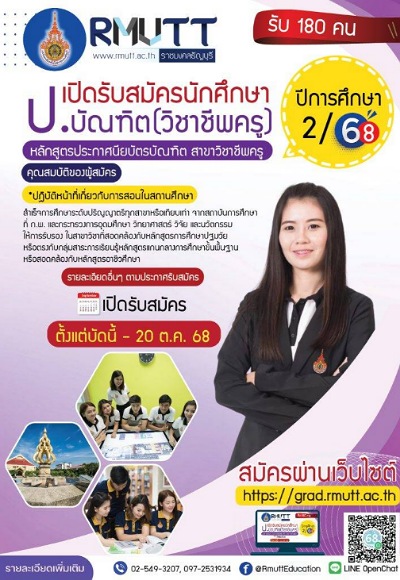 คณะครุศาสตร์อุตสาหกรรม มหาวิทยาลัยเทคโนโลยีราชมงคลธัญบุรี (มทร.ธัญบุรี) เปิดรับสมัครและสอบคัดเลือกบุคคลเข้าศึกษาระดับประกาศนียบัตรบัณฑิต สาขาวิชาชีพครู ภาคพิเศษ ประจำภาคการศึกษาที่ 2 ปีการศึกษา 2568 ตั้งแต่บัดนี้ – 20 ตุลาคม 2568 โดยคุณสมบัติของผู้สมัคร สำเร็จการศึกษาระดับปริญญาตรีทุกสาขาหรือเทียบเท่า จากสถาบันการศึกษาที่ ก.พ. และกระทรวงการอุดมศึกษาวิทยาศาสตร์วิจัย และนวัตกรรม ให้การรับรอง ในสาชาวิชาที่สอดคล้องกับหลักสูตรการศึกษาปฐมวัย หรือตรงกับกลุ่มสาระการเรียนรู้หลักสูตรแกนกลางการศึกษาขั้นพื้นฐาน หรือสอดคล้องกับหลักสูตรอาชีวศึกษา ผู้สนใจสามารถสมัครได้ทาง www.gadrmuttacth หรือสอบถามเพิ่มเติมได้ที่ www.facebook.com/RmuttEducation โทร. 0-2549-3207 097-2531934 https://grad.rmutt.ac.th/