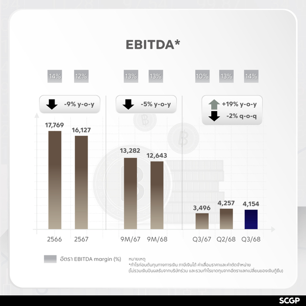 การปรับกลยุทธ์เชิงรุกท่ามกลางความท้าทาย ทำให้ในไตรมาสที่ 3 ของปี 2568 SCGP มีรายได้จากการขายรวม 30,438 ล้านบาท ลดลงร้อยละ 9 เมื่อเทียบกับปีก่อน และลดลงร้อยละ 4 จากไตรมาสก่อน ขณะที่ EBITDA อยู่ที่ 4,154 ล้านบาท เพิ่มขึ้นร้อยละ 19 เมื่อเทียบกับปีก่อน ลดลงร้อยละ 2 จากไตรมาสก่อน และมีกำไรสำหรับงวด 953 ล้านบาท เพิ่มขึ้นร้อยละ 65 เมื่อเทียบกับปีก่อนจากผลการดำเนินงานของธุรกิจบรรจุภัณฑ์กระดาษในอินโดนีเซียที่ดีขึ้น ขณะที่ลดลงร้อยละ 6 จากไตรมาสก่อนสอดคล้องกับรายได้ ส่วน EBITDA margin ปรับตัวดีขึ้นจากการบริหารจัดการต้นทุนพลังงานและสาธารณูปโภคในกระบวนการผลิตอย่างมีประสิทธิภาพ