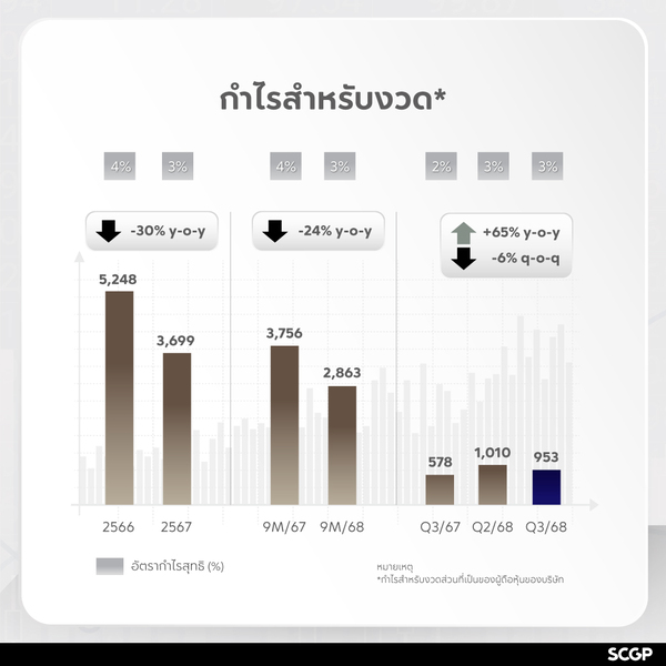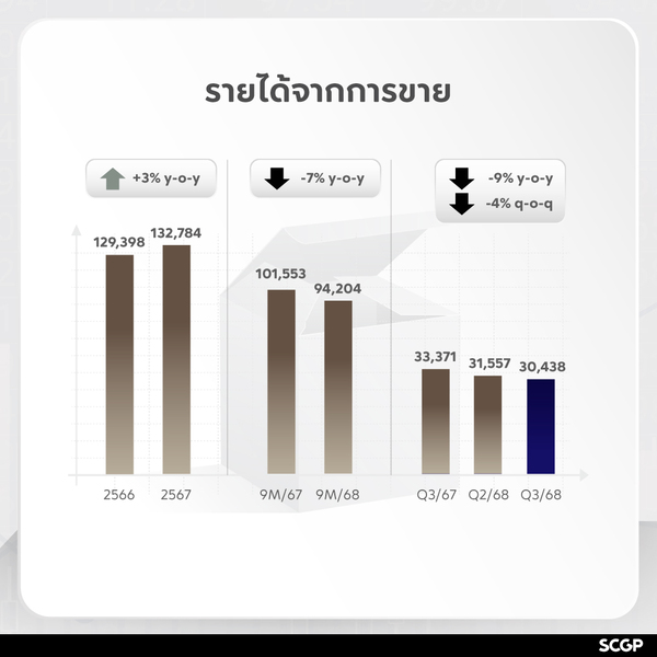 SCGP แถลงผลการดำเนินงานไตรมาส 3 ปี 2568 ทำรายได้จากการขาย 30,438 ล้านบาท EBITDA 4,154 ล้านบาท และกำไรสำหรับงวด 953 ล้านบาท จากปริมาณการขายเพิ่มขึ้นและบรรจุภัณฑ์เพื่อผู้บริโภคที่เติบโตในอาเซียนตามแผน วางกลยุทธ์บริหารต้นทุนที่มีประสิทธิภาพ บูรณาการห่วงโซ่อุปทานของโรงงานในภูมิภาค พร้อมนำเทคโนโลยีมาใช้เพิ่มประสิทธิภาพ คาดไตรมาส 4 ได้รับผลบวกจากการเติมสต๊อกสินค้าช่วงปลายปี การออกมาตรการกระตุ้นเศรษฐกิจและการท่องเที่ยวของรัฐบาล