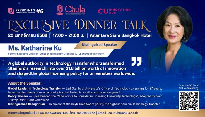 จุฬาลงกรณ์มหาวิทยาลัยขอเชิญชวนบุคคลทั่วไป ผู้สนใจด้านนวัตกรรม และบุคลากรในระบบนิเวศธุรกิจนวัตกรรม เข้าร่วมรับชมการถ่ายทอดสด (Live Streaming) งาน “President’s Distinguished Speaker” ครั้งที่ 6 เพื่อเปิดมุมมองและรับฟังแนวคิดจากสองผู้นำระดับโลกด้านนวัตกรรม และทรัพย์สินทางปัญญาที่จะมาร่วมแบ่งปันประสบการณ์การพัฒนาระบบนิเวศนวัตกรรมและการจัดการทรัพย์สินทางปัญญาในระดับสากล
