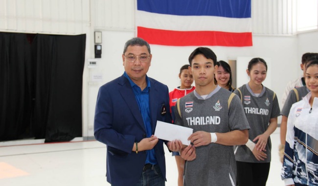 จากนั้น ดร.ณัฏฐ์ ธีรณัฐสุภานนท์ ได้มอบกระเช้าผลไม้ และเงินสนับสนุนการฝึกซ้อมจำนวน 20,000 บาท พร้อมให้โอวาทแก่นักกีฬายิมนาสติกส์ทีมชาติไทย “โดยขอให้นักกีฬายิมนาสติกส์ทุกคนมีความระมัดระวังในเรื่องของอาการบาดเจ็บจากการฝึกซ้อม ขอให้เก็บพลกำลังและความตั้งใจทั้งหมดไปโชว์พลังแห่งนักกีฬาไทย ในช่วงของการแข่งขัน และตั้งใจทำหน้าที่ตัวแทนประเทศไทยในสนามแข่งขันกีฬาซีเกมส์ เพื่อสร้างชื่อเสียงเกียรติยศให้กับตัวเองและครอบครัว รวมถึงคนไทยทั้งประเทศ ผมในนามของมูลนิธิกองทุนพัฒนาการกีฬา รวมถึงกรรมการบริหารทุกท่าน จะร่วมส่งแรงใจไปเชียร์ให้น้องๆทุกคนประสบความสำเร็จในการแข่งขันกีฬาซีเกมส์เช่นเดียวกับคนไทยทั้งประเทศ