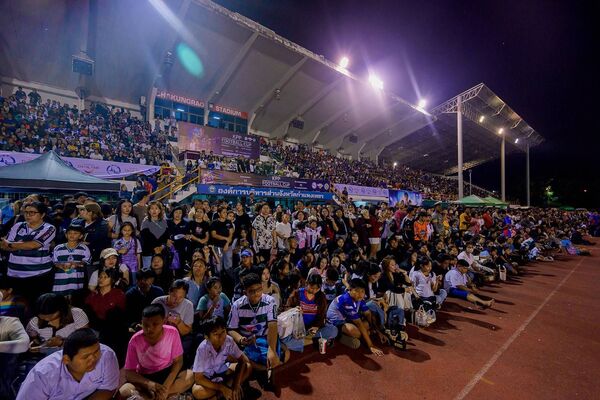 เสียงเชียร์ดังกระหึ่มเมื่อนักเตะลงสู่สนาม แฟนบอลถึงกับต้องลงมานั่งติดขอบสนามเพื่อชมความมันส์!