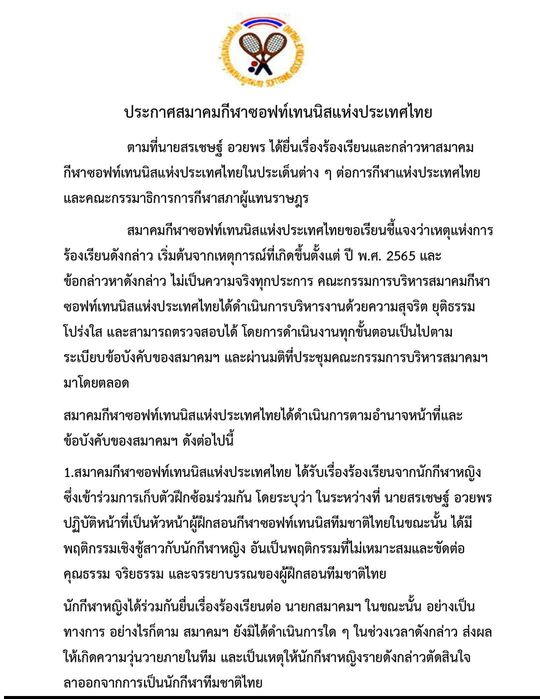 1.สมาคมกีฬาซอฟท์เทนนิสแห่งประเทศไทย ได้รับเรื่องร้องเรียนจากนักกีฬาหญิง