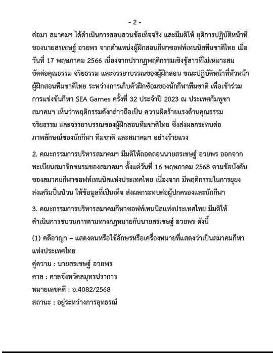2. คณะกรรมการบริหารสมาคมกีฬาซอฟท์เทนนิสแห่งประเทศไทย มีมติให้