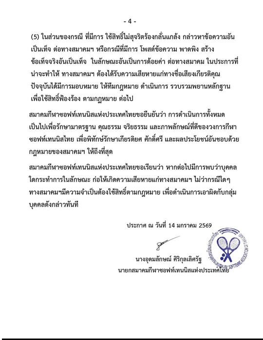 สมาคมกีฬาซอฟท์เทนนิสแห่งประเทศไทย ประกาศขอใช้สิทธิ์กรณีที่มีการ โพสต์ข้อความ พาดพิง สร้าง