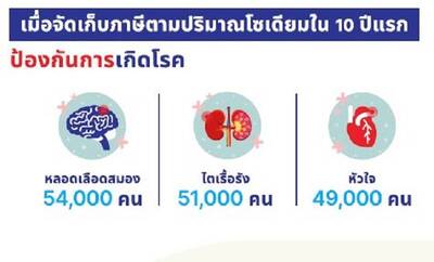 จากการเปิดเวทีเสวนา “ภาษีโซเดียม”ในการจัดเสวนาหนุนมาตรการเชิงระบบช่วยคนไทย โดยการบริโภคอาหารที่มีปริมาณโซเดียมสูงเป็นสาเหตุให้เกิดภาวะความดันโลหิตสูงและเพิ่มความเสี่ยงต่อการเกิดโรคหัวใจและหลอดเลือดและโรคไตเรื้อรังได้ ซึ่งปัจจุบันแนวโน้มการบริโภคโซเดียมโดยเฉลี่ยของคนไทยเพิ่มขึ้นร้อยละ 12 จาก 3,264 มิลลิกรัม (มก.)/วัน ซึ่งจากการสำรวจสถานการณ์การบริโภคอาหาร ความมั่นคงทางอาหารและความรอบรู้ด้านอาหารของประชาชนไทยพบว่าคนไทยอายุ 20 ปีขึ้นไป บริโภคบะหมี่กึ่งสำเร็จรูปโดยเฉลี่ย 22 กรัม/วัน และ14 กรัม/วัน ในเพศชายและเพศหญิง ขณะที่มีการบริโภคขนมขบเคี้ยว โดยเฉลี่ย 32 กรัม/วัน และ29 กรัม/วัน ในเพศชายและเพศหญิง ทำให้การคาดการณ์จัดเก็บภาษีตามปริมาณโซเดียมใน 10 ปีแรก จะสามารถป้องกันการเกิดโรคกับผู้ป่วยรายใหม่ของโรคหัวใจและหลอดเลือดและโรคไต คาดว่าป้องกันได้ประมาณ155,000 (132,455-176,859) ราย หากดำเนินการจัดเก็บภาษีตามปริมาณโซเดียมทั้งในบะหมี่กึ่งสำเร็จรูปและขนมขบเคี้ยวใน 10 ปีแรกต่อจากนี้ จะป้องกันโรคหลอดเลือดสมองได้มากที่สุดในเพศชายจำนวน 33,673 (23,347-43,954) ราย รองลงมาคือโรคหลอดเลือดสมองในเพศหญิง จำนวน 20,772 (14,821-27,039) ราย (ข้อมูลจาก ดร.พจนา หันจางสิทธิ์ สถาบันวิจัยประชากรและสังคม มหาวิทยาลัยมหิดล)