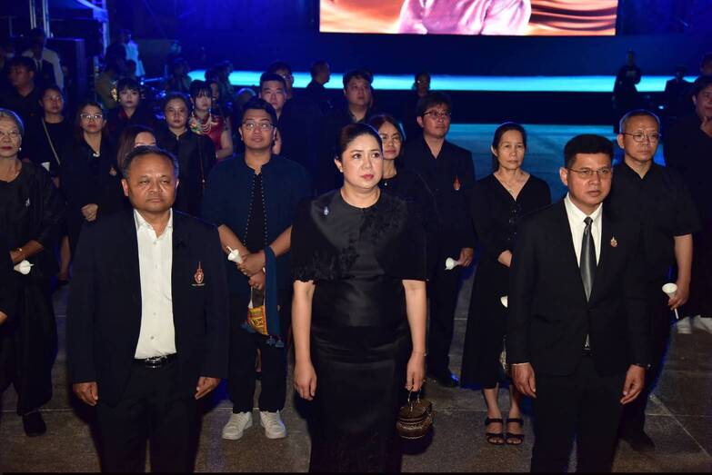 จากนั้นเป็น การบรรเลงวงดนตรีสากลในบทเพลงพระราชนิพนธ์ อันทรงคุณค่า โดยคณะศิลปกรรมศาสตร์ เพื่อร่วมน้อมรำลึกในพระอัจฉริยภาพ และพระมหากรุณาธิคุณผ่านท่วงทำนองแห่งเสียงดนตรี พร้อมด้วยการสร้างประวัติศาสตร์ความอาลัยผ่าน การกล่าวสุนทรพจน์ 4 ภาษา ประกอบด้วยภาษาจีน ภาษาญี่ปุ่น ภาษาอังกฤษ และภาษาไทย ตามลำดับ โดยคณะศิลปศาสตร์ เพื่อประกาศพระเกียรติคุณให้ขจรขจายสู่สากล กระทั่งเข้าสู่ช่วงพิธีการหลักในเวลา 19.10 น. รศ.ดร.สมหมาย ผิวสอาด อธิการบดี มทร.ธัญบุรี เป็นประธานกล่าวสำนึกในพระมหากรุณาธิคุณและประกอบพิธีวางพวงมาลา “บุปผชาติ พิไลน้อมถวายพระพันปี”