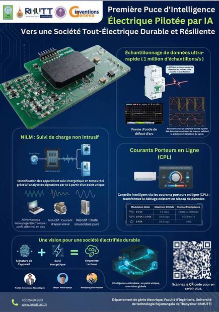 ศาสตราจารย์ ดร.กฤษณ์ชนม์ ภูมิกิตติพิชญ์ รองอธิการบดีมหาวิทยาลัยเทคโนโลยีราชมงคลธัญบุรี (มทร.ธัญบุรี) และหัวหน้าคณะวิจัย เปิดเผยความสำเร็จจากการเข้าร่วมประกวดในงาน The 51st International Exhibition of Inventions Geneva 2026 ณ นครเจนีวา สมาพันธรัฐสวิส โดยผลงานนวัตกรรม The First AI-Driven Electrical Intelligence Chip for Future Sustainability and Resilience All-Electric Society ซึ่งพัฒนาโดยคณะผู้วิจัยจากคณะวิศวกรรมศาสตร์ ศาสตราจารย์ ดร.กฤษณ์ชนม์ ภูมิกิตติพิชญ์ และคณะนักวิจัยสามารถคว้าชัยชนะมาได้ถึง 3 รางวัล คือ รางวัลพิเศษบนเวที Special Prize on Stage จาก Taiwan Invention Association รางวัลเหรียญเงิน Silver Medal และรางวัล NRCT Special Award จากสำนักงานการวิจัยแห่งชาติ (วช.) ซึ่งเป็นหน่วยงานหลักที่ช่วยผลักดันผลงานวิจัยไทยให้ก้าวสู่เวทีระดับนานาชาติในครั้งนี้