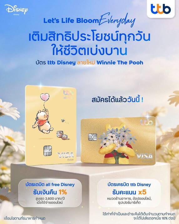 • ทีทีบี เปิดตัวดีไซน์หน้าบัตรลายใหม่ “หมีพูห์” ทั้งบัตรเดบิต ttb all free Disney ลาย “Winnie the Pooh” และบัตรเครดิต ttb Disney ลาย “Pooh Blooms” พร้อมเติมความน่ารักให้ทุกไลฟ์สไตล์การใช้จ่ายกับ e-Slip 3 ดีไซน์ใหม่ ควบคู่สิทธิประโยชน์และโปรโมชันพิเศษครบครัน โดยผู้ที่สนใจสามารถสมัครบัตรเดบิต ttb all free Disney และบัตรเครดิต ttb Disney ได้ที่แอปพลิเคชัน ttb touch และเว็บไซต์ทีทีบี หรือที่ทีทีบีทุกสาขา